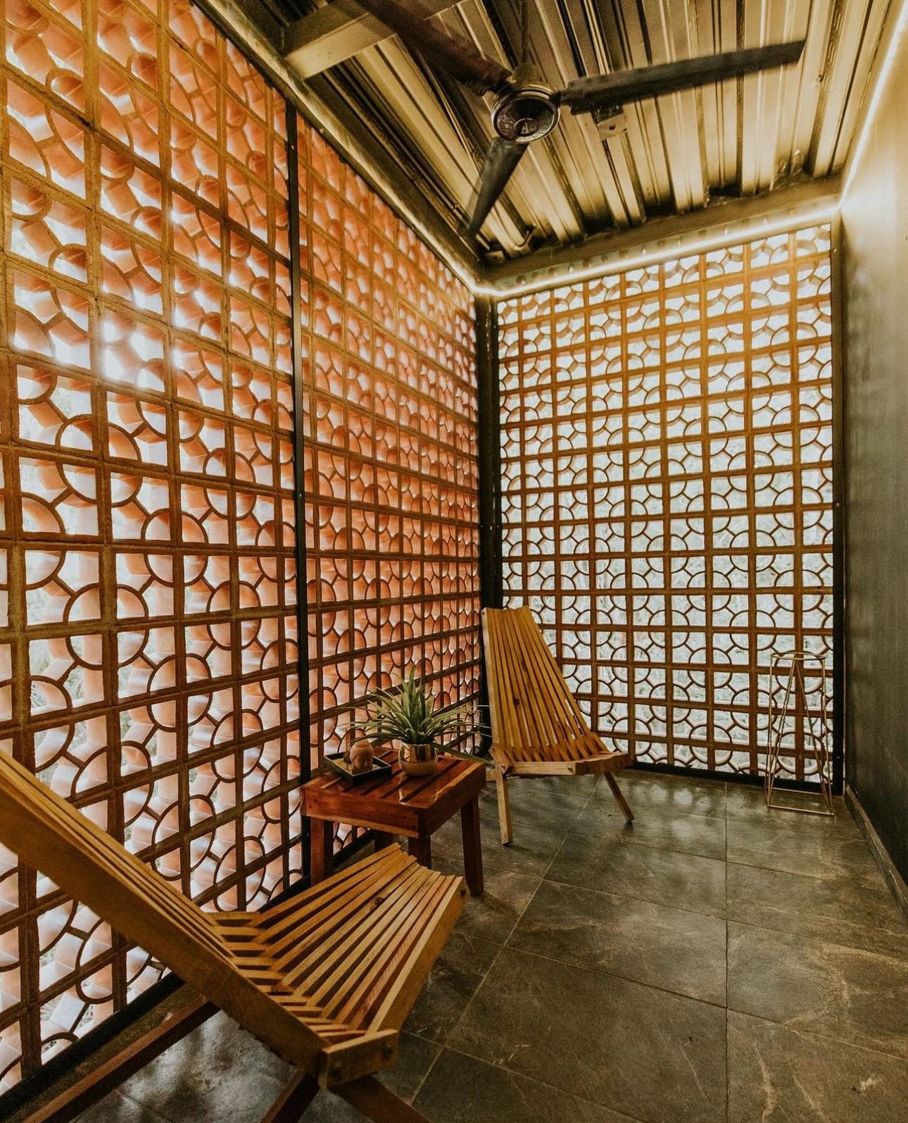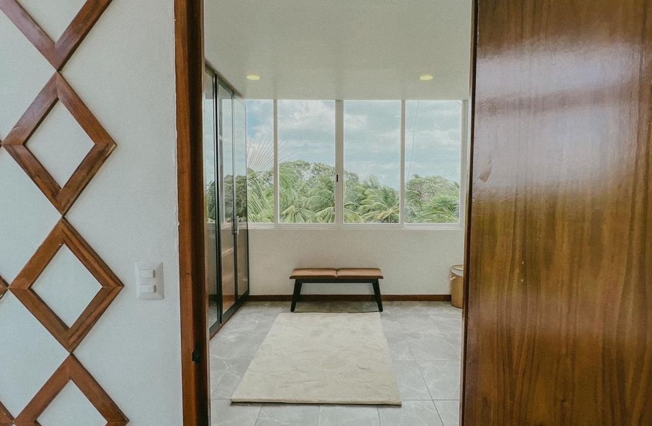 La casa celosía, es un modelo único hecho, como su nombre lo dice, con celosía roja para partes decorativas y sobretodo en algunos espacios de la casa para mejor ventilación del aire y al mismo tiempo mayor privacidad. Los colores negro, con los diseños y muebles de madera de la región (tzalam), decoraciones con tonos dorados, un jardín interno con luz natural y plantas, le dan un mayor toque elegante y acogedor a ésta casa que cuenta con 2 plantas, estacionamiento, piscina, jardín interno, sala, cocina, comedor, medio baño, 2 habitaciones con baño propio y un espacio con ventilación y luz natural en cada cuarto.