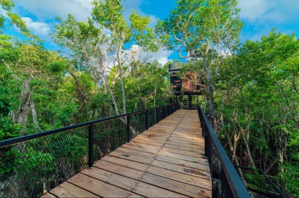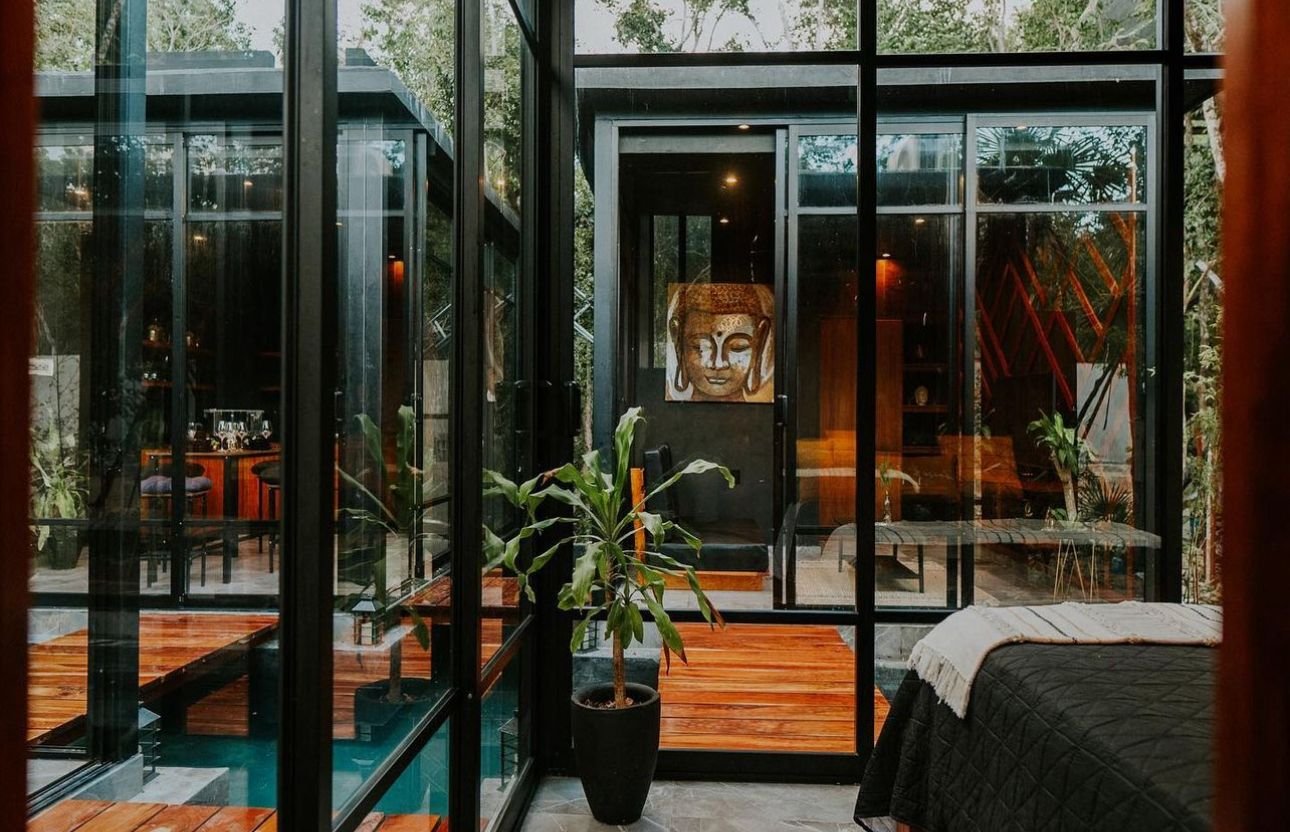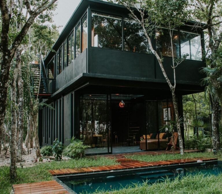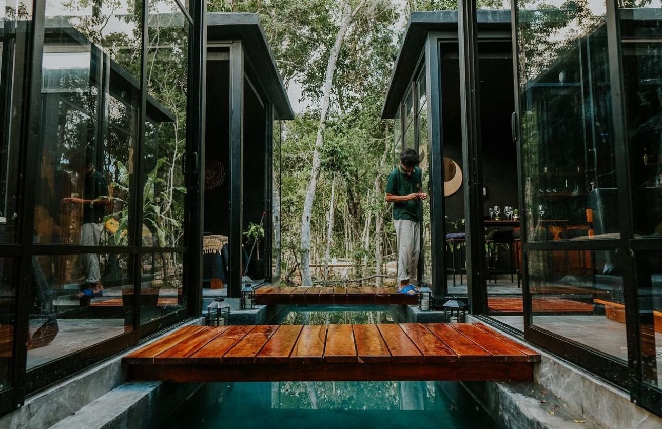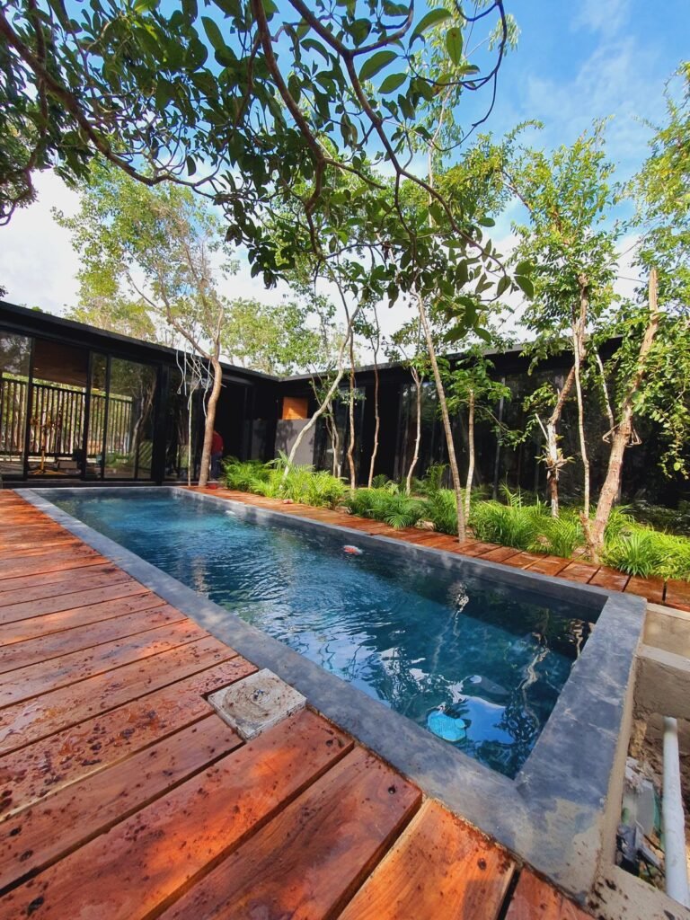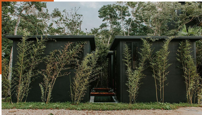 Ésta tiny house, es un estilo diferente, como su nombre lo dce: ‘’zen’’, para éste modelo nos basamos en los jardines zen japoneses tanto en el diseño como en el terreno. Está distribuida por 4 cubículos que los une un puente de madera de tzalam ya que alrededor está una piscina en forma de cruz, hecha de chukum negro. Cuenta con 2 cubículos que son las habitaciones con baño propio cada uno y a/c, conectándose a la cocina con comedor, y posteriormente a la sala que cuenta con medio baño y clóset.