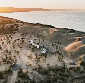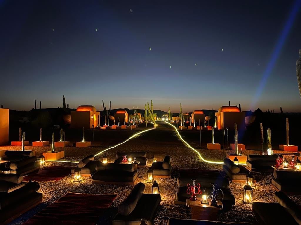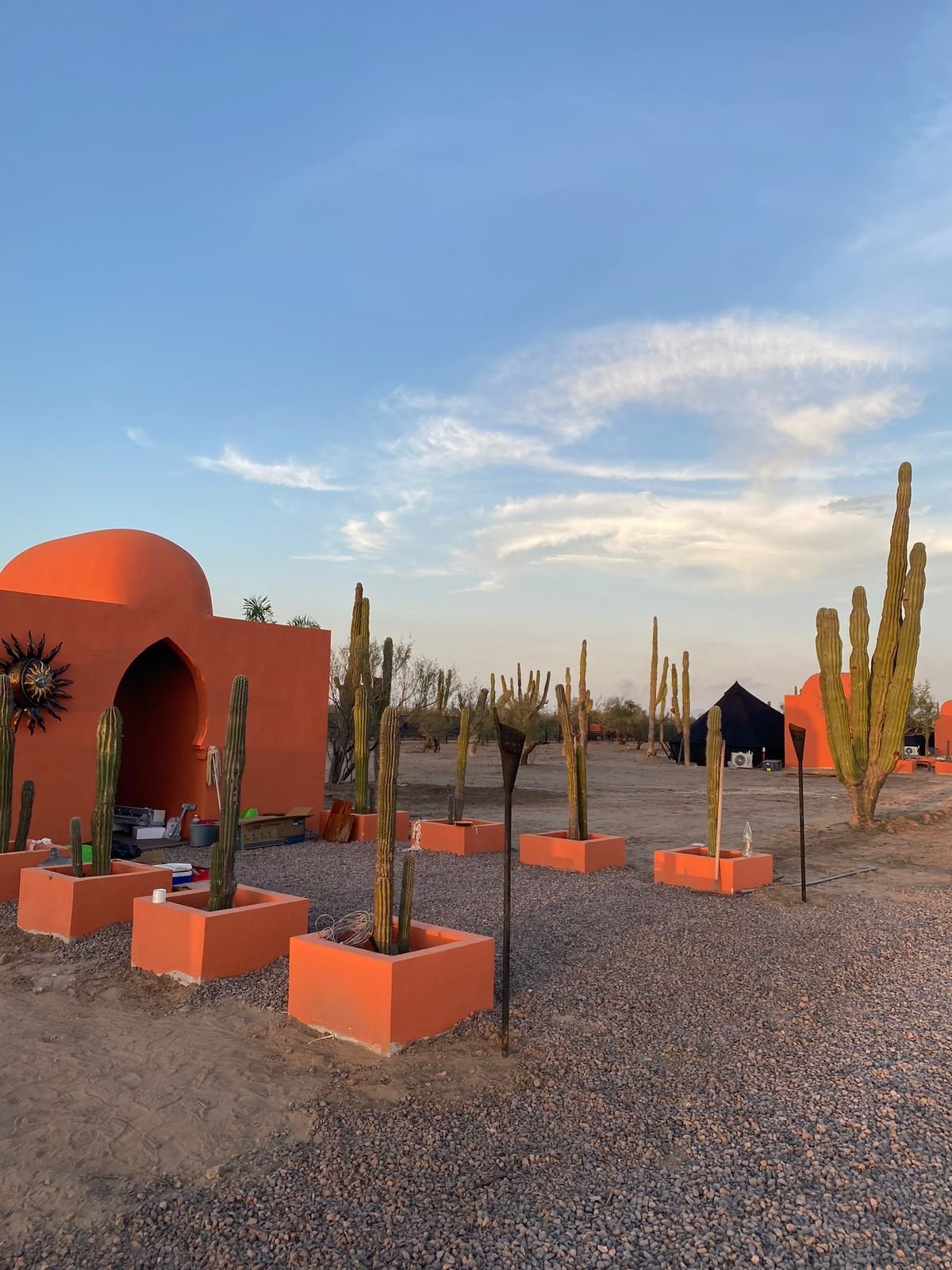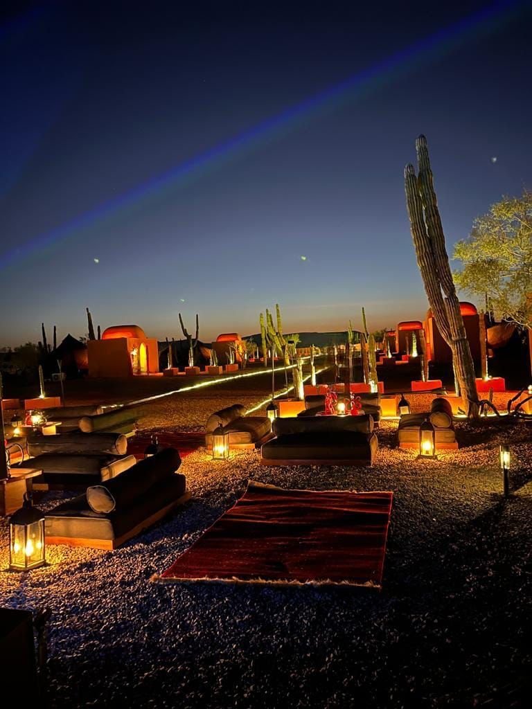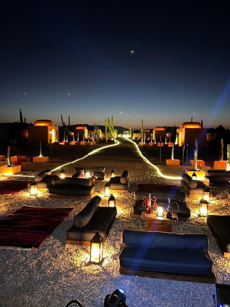 Ubicadas en La Paz, Baja California Sur; este es un proyecto inspirado en las carpas estilo marroquíes en medio del desierto. Ambientamos un espacio en medio del desierto, donde cada casa tiene una estructura de concreto que es el baño completo de la casa carpa, con colores cálidos, y el suelo de éste es un deck de madera de tzalam en forma circular; por dentro cuenta con a/c ya que el clima es caluroso, cama matrimonial y una pequeña sala, además de que toda la decoración es acorde al estilo marroquí con colores cálidos, toques de negro con dorado y sobretodo, en el exterior, antorchas de fuego para ambientar aún más.