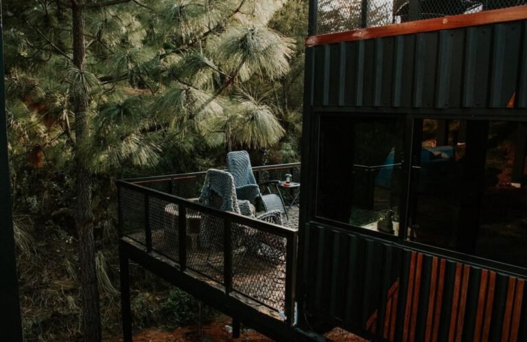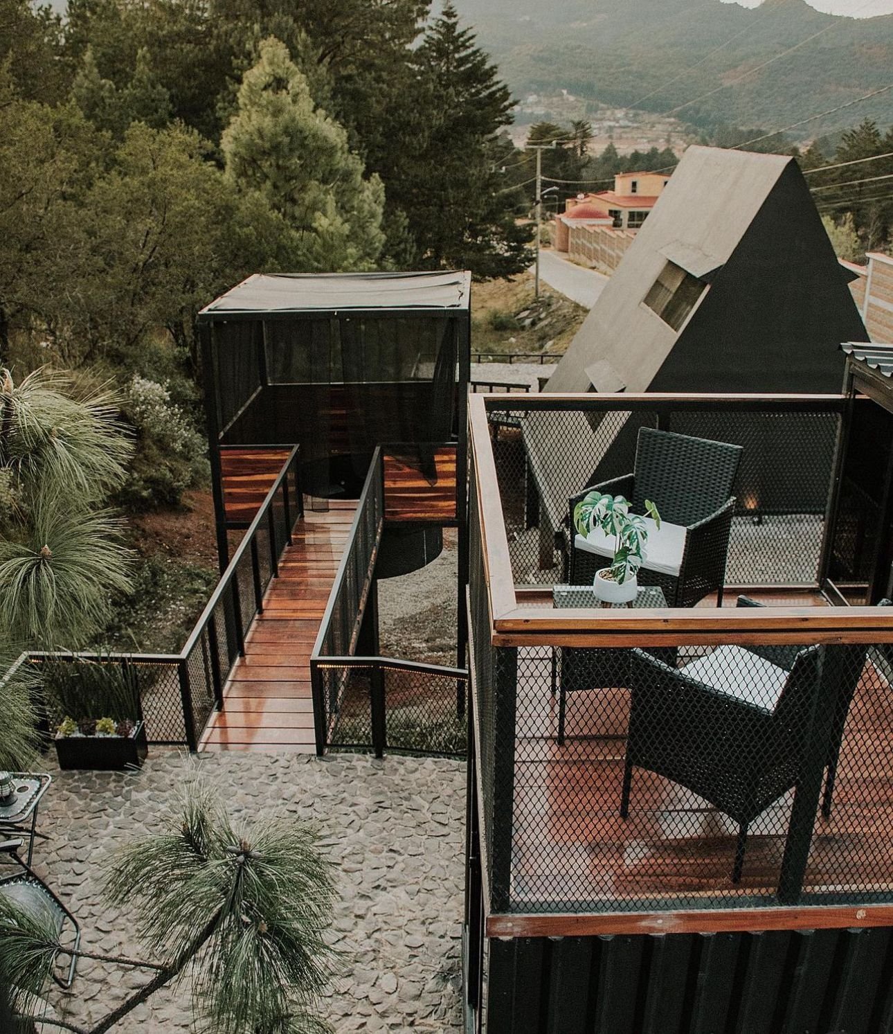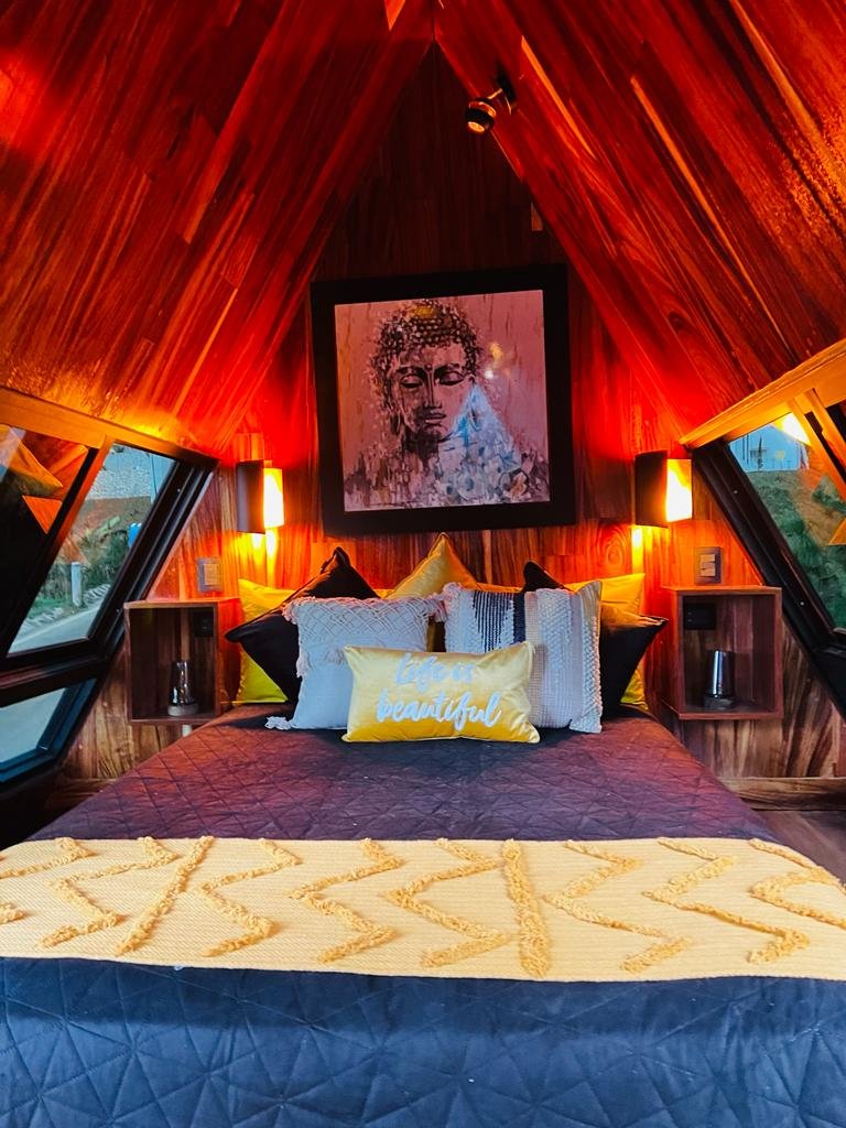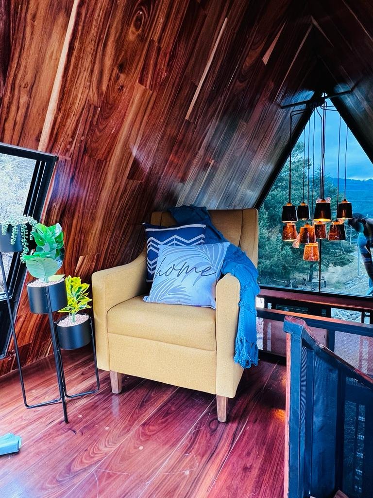Esta cabaña prefabricada triangular está ubicada en Velasco, Hidalgo; un pequeño pueblo con clima templado y unos bosques con pinos altos. La cabaña tiene un estilo singular en forma de triángulo. Fue construida con vigas de acero, toda la construcción de las piezas fue de 1 mes, y el armado de la cabaña tuvo una duración de tan sólo 2 días, ya decorada y ambientada para su uso. Cuenta con doble altura, una pequeña sala, cocina, un pequeño comedor para dos personas, baño, en la parte de arriba la habitación con vista a los pinos; en la parte exterior, cuenta con un espacio para estacionamiento privado.