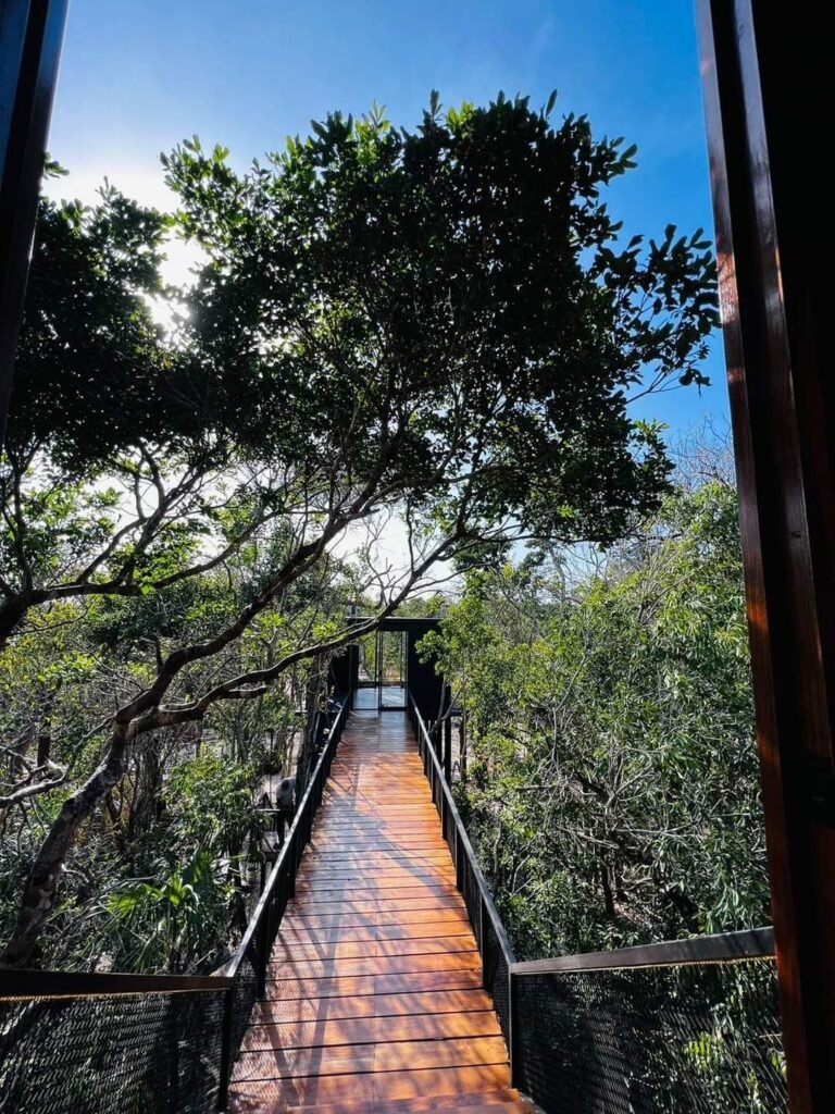 Yuum’ Ha, es un desarrollo de lotes fraccionados ubicado en Chetumal, Quinatan Roo, contando con frente de mar. Para éste desarrollo, construimos un edificio de 3 pisos muy amplio, destinado a ser las amenidades de éste fraccionamiento. En la primera planta cuenta con baños para hombre y mujer y un bar con una gran extensión de vinos y bebidas, en la segunda planta un espacio destinado a ser un gran espacio de biblioteca en donde los residentes puedan disfrutar de leer en tranqulidad o un espacio de trabajo con la brisa y vista del mar. El tercer piso que es al aire libre, cuenta con sillas de mimbre con mesas ideal para disfrutar de una bebida o poder comer al aire libre con una vista panorámica del mar y la selva. En el frente de mar cuenta con camastros para un momento de relajación y un bello muelle amplio hecho de madera de tzalam.