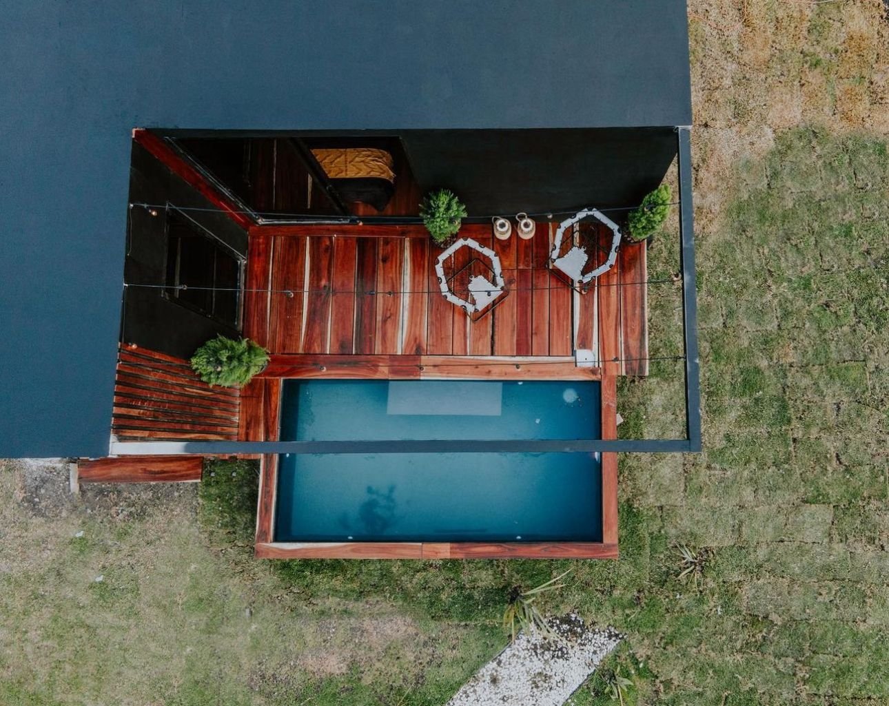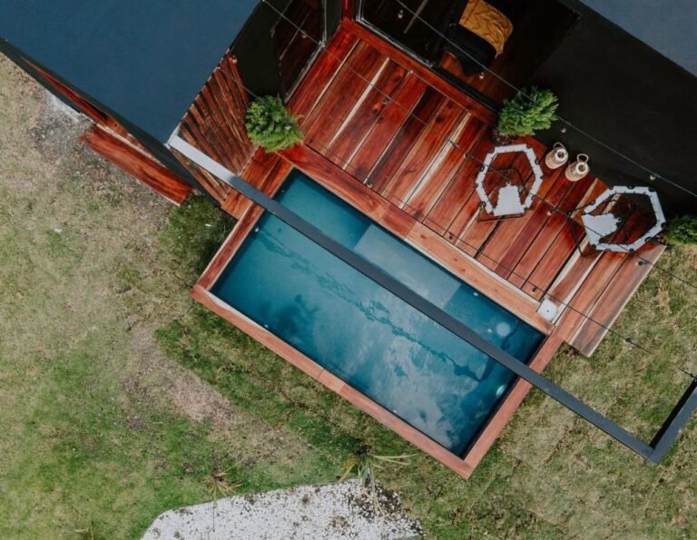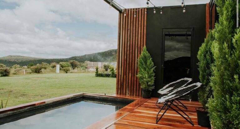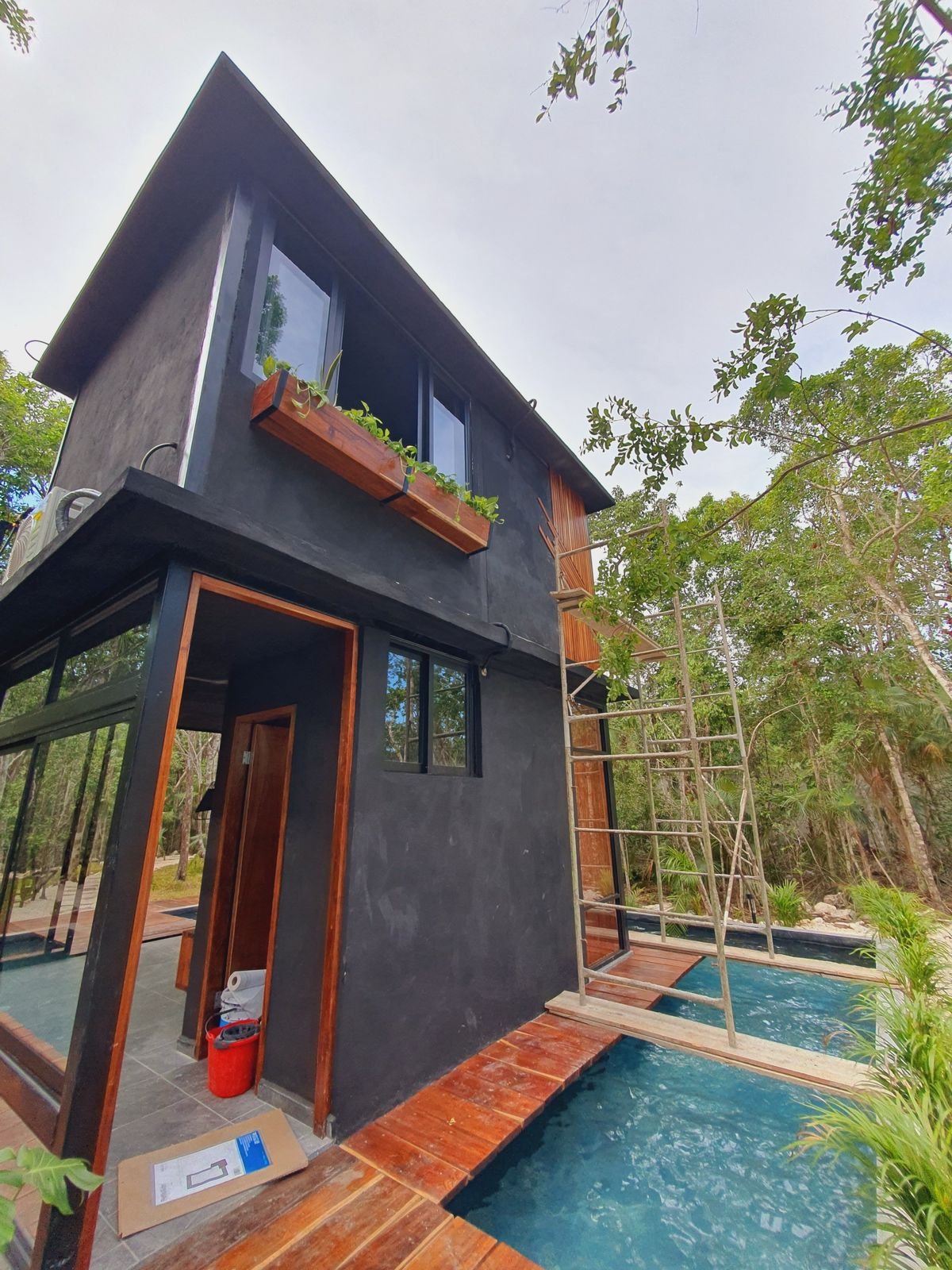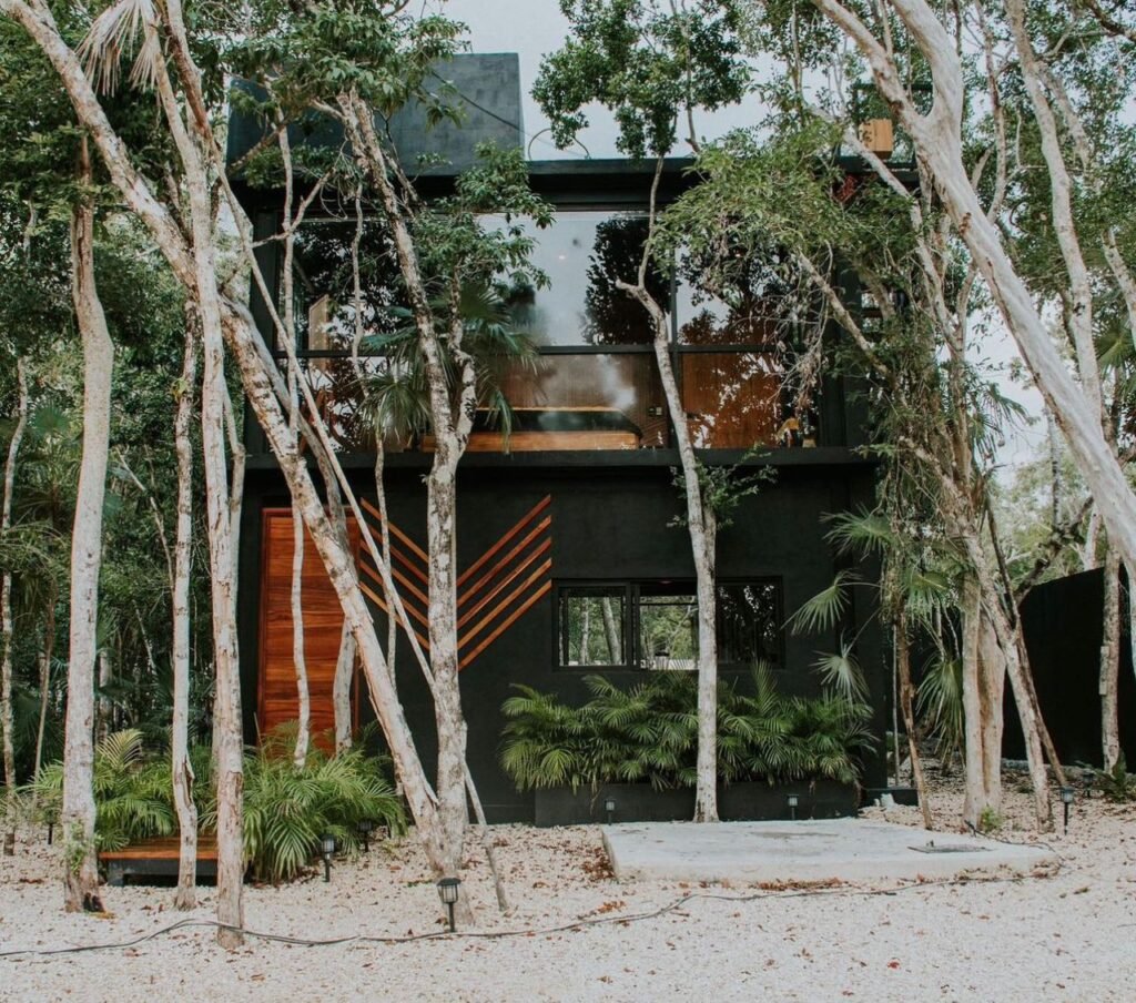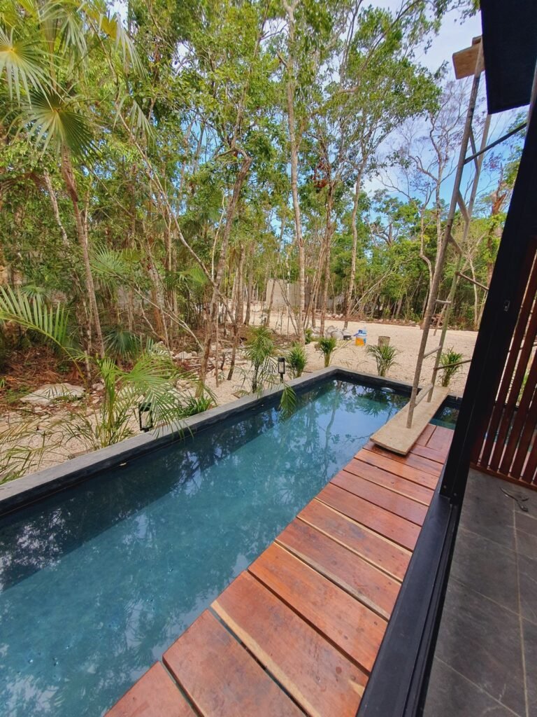 Las tiny houses, (en español: casas pequeñas), son como su nombre lo dice, casas que se reduce todo lo necesario de una a un pequeño espacio para mayor practicidad. La Tiny House Agua, lleva éste nombre ya que se encuentra rodeada de una piscina hecha de chukum negro, y para poder cruzar un pequeño puente de madera de la región. En el interior, cuenta con 2 plantas, en la primera está la habitación, el baño completo y las escaleras de caracol que dan a la segunda planta en donde se encuentra la cocina y la barra desayunadora hechas de granito negro con madera de tzalam y un balcón donde se encuentra un pequeño comedor al aire libre con vista a la selva de Tulum, Q.Roo.